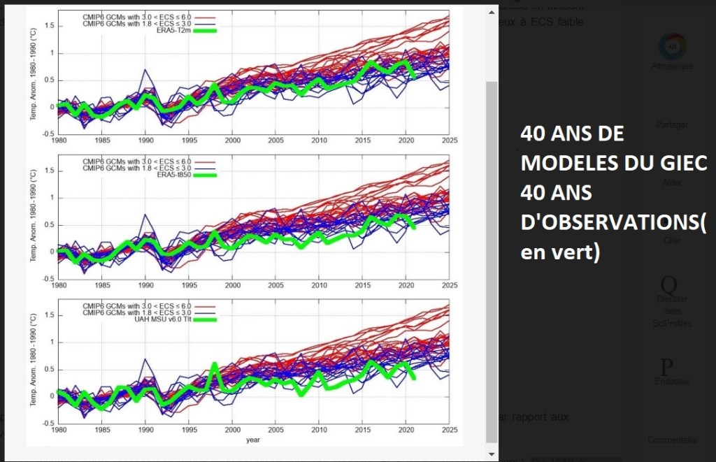 43 ], il existe également de vastes régions qui ont connu un refroidissement de 1980-1990 à 2011-2021. Ces régions de refroidissement ne sont généralement pas prédites par les modèles. Les modèles prédisent également en moyenne des courants océaniques qui se réchauffent trop vite, comme les courants du Pérou et du Pacifique sud-équatorial (où se produit le phénomène ENSO), les courants du Pacifique californien et de l’Atlantique des Canaries.Les résultats ci-dessus suggèrent que les modèles CMIP6 présentent de sérieux problèmes dans la modélisation des circulations atmosphérique et océanique, la rétroaction de l’albédo liée à la formation et à la fonte des glaciers et de la glace de mer, et la nébulosité entre les régions tempérées et subpolaires. De sérieuses différences entre les 38 MCG CMIP6 analysés ici sont également mises en évidence par une simple comparaison visuelle entre les images représentées dans l’ annexe