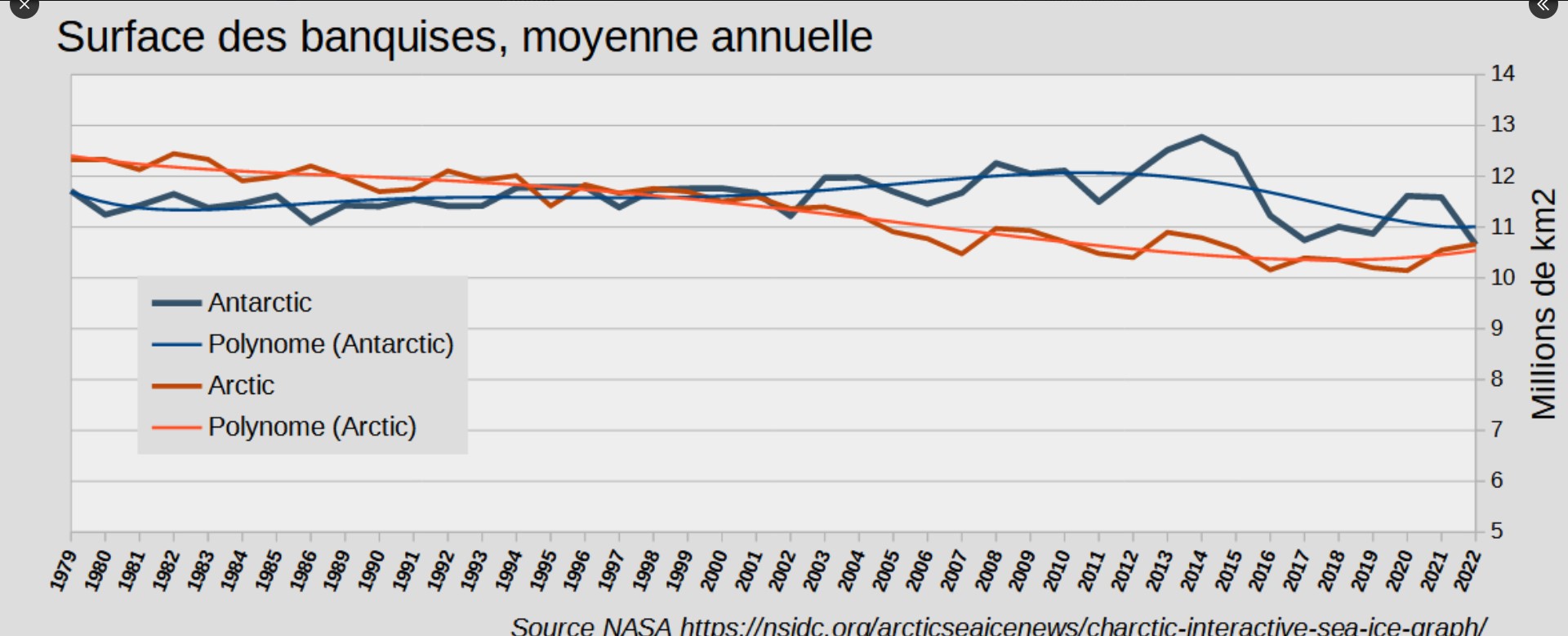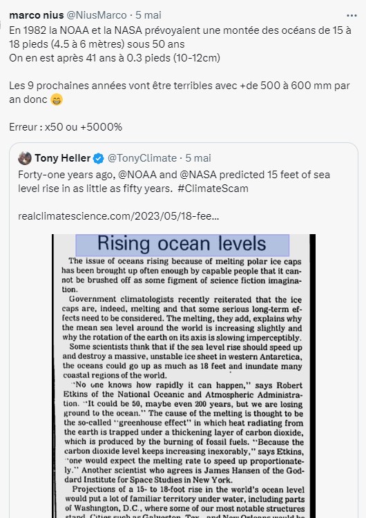 Les observations de la Nasa :en 50 ans les banquises des pôles n’ont reculé que de 10%, leur disparition était prévue par la presse pour 1989, le niveau de la mer aurait du monter de 6m (10cm en réalité)