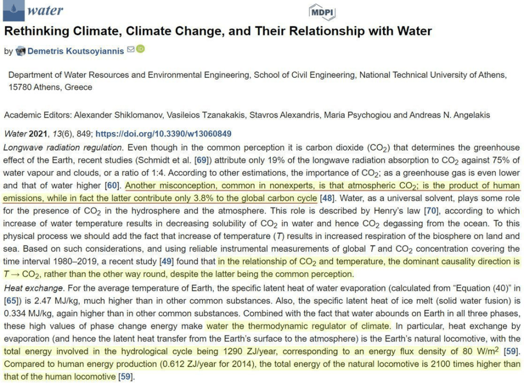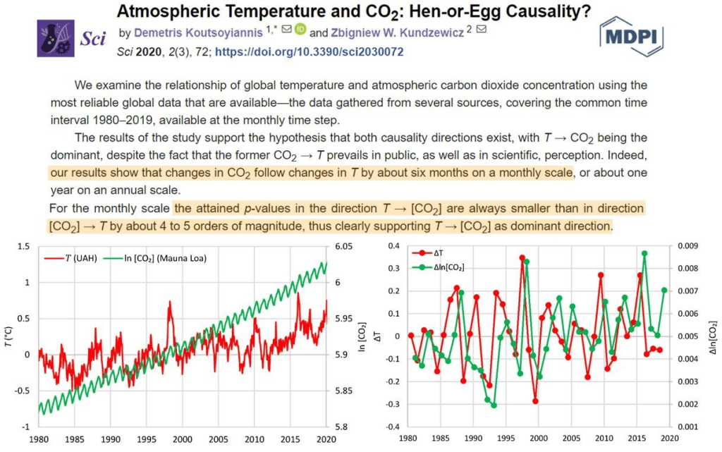 “Une idée fausse courante est que le CO2 atmosphérique est le produit des émissions humaines, alors qu’en fait ces dernières ne contribuent que pour 3,8%. La direction dominante de la causalité est T➝CO2 plutôt que l’inverse.” http://sciencepublishinggroup.com/journal/paperinfo?journalid=161&doi=10.11648/j.earth.20190803.13…