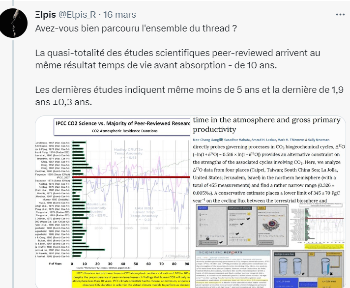 Le temps de résidence du CO2 dans l’atmosphère est ~10 ans ou moins (36 estimations scientifiques) Une étude de 2023 l’évalue à 5 ans “Si le temps de résidence est inférieure à 30 ans, les injections de CO2 dans l’atmosphère auraient tout comme l’eau, pas d’effet sur le climat”