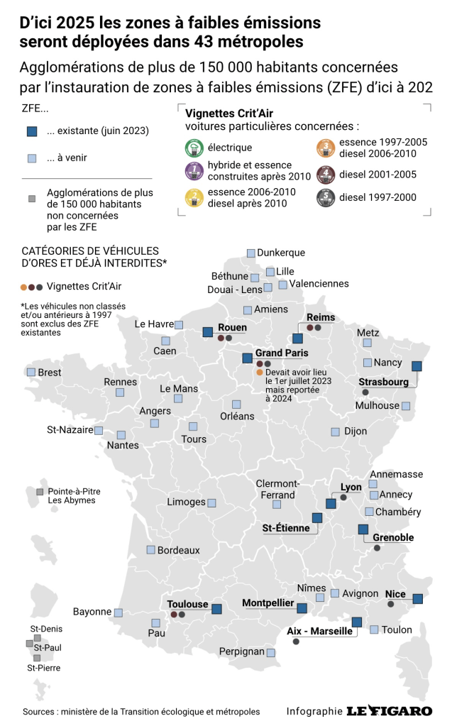 ZFE: encore méconnues de certains Français, ces trois lettres sont devenues le cauchemar des automobilistes et de certains élus qui y sont confrontés. Cet acronyme désigne les zones à faibles émissions, ces périmètres dans lesquels les véhicules les plus polluants ne pourront bientôt plus circuler, selon un calendrier fixé par l’État. Déjà onze dispositifs de ce type ont été installés dans les métropoles les plus polluées comme Paris, Lyon, Marseille, ou encore Grenoble et Rouen. Avant le 31 décembre 2024, 32 autres ZFE seront créées dans les agglomérations de plus de 150.000 habitants. Soit 43 au total.