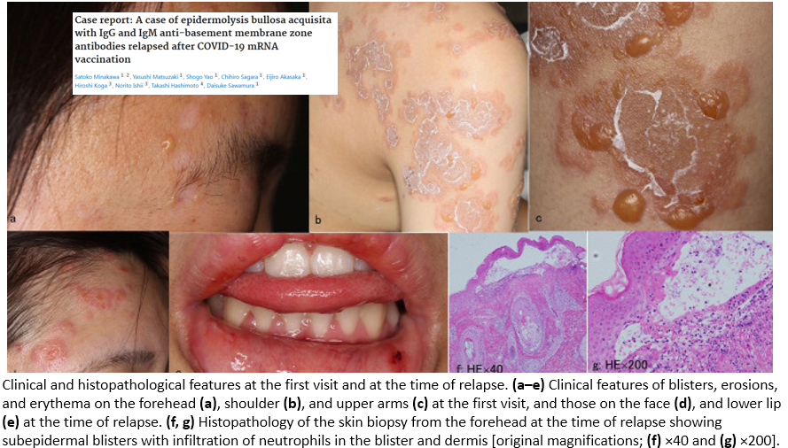 « Les cliniciens doivent être conscients que les AIBD de type pemphigoïde bulleuse, y compris la pemphigoïde EBA et IgM, peuvent se développer après la vaccination par l’ARNm du COVID-19. » https://frontiersin.org/articles/10.3389/fmed.2023.1093827/full