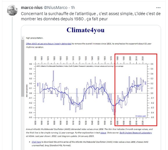 Les relevés climatiques sont les mêmes pour tout le monde mais les journaleux choisissent bien ?Ainsi la surchauffe Atlantique est monstrueuse depuis 1980, mais normale dans une logique cyclique sur 150 ans