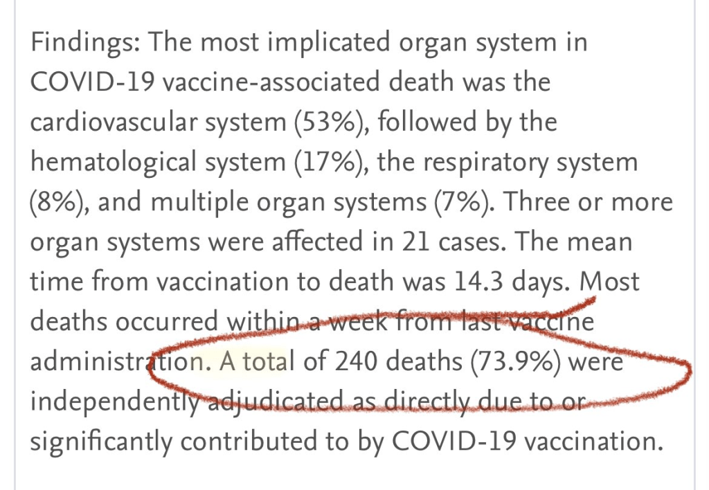 Sur de 325 autopsies réalisées dans le monde entier, 73.9% concluent à la responsabilité des injections ARN;… Est ce à dire que si les17540 personnes décédés après la vaccccc, 75% ont bien été tués par les injections???????????????????????????????????????