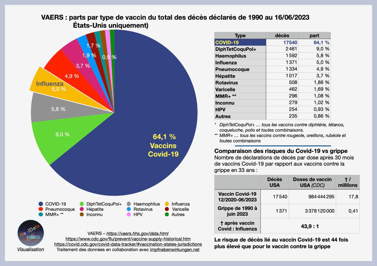 Il faut rappeler que 17540 décès ont été rapportés comme liés aux vaccins covid pour les seuls Etats Unis à la pharmacovigilance VEARS. Tous les décès n’ont pas été rapportés loin de là mais les média rabachent que , en réalité les vacccxxx n’y sont pour rien…..