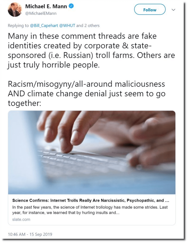 Michael Mann , l’auteur de la courbe de hockey des températures que les médias vous montrent sans cesse se trouve en plein délire complotiste et paranoïaque. Les sceptiques du climat seraient payés par les russes racistes misogynes et des horribles personnes. L’argument scientifique est à la hauteur du personnage.