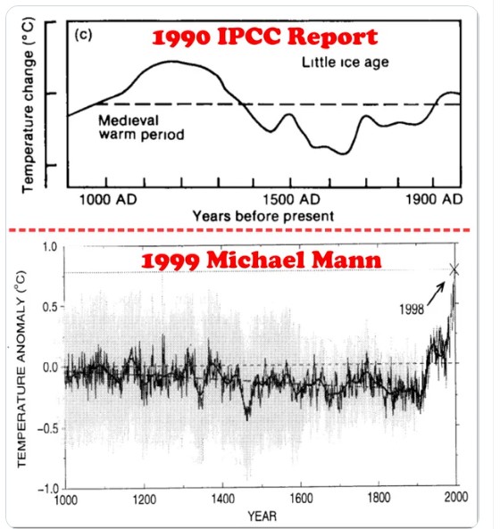 Cette courbe qui occultait l’ « optimum médiéval » et le « petit âge glaciaire » visait à montrer que le réchauffement actuel était sans précédent depuis 1000 ans ; elle devint célèbre sous le nom de courbe en « crosse de hockey ».