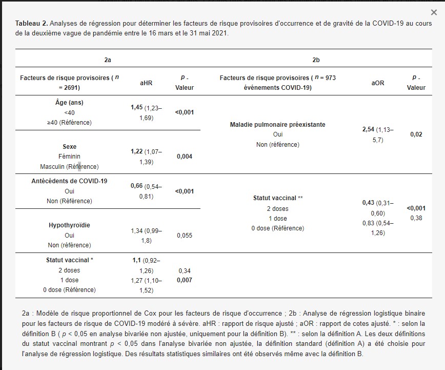 .Conclusions : La vaccination n’a offert qu’une protection marginale contre sa survenue. La relation possible entre l’asthme et l’hypothyroïdie et les résultats du COVID-19 nécessite des recherches ciblées.