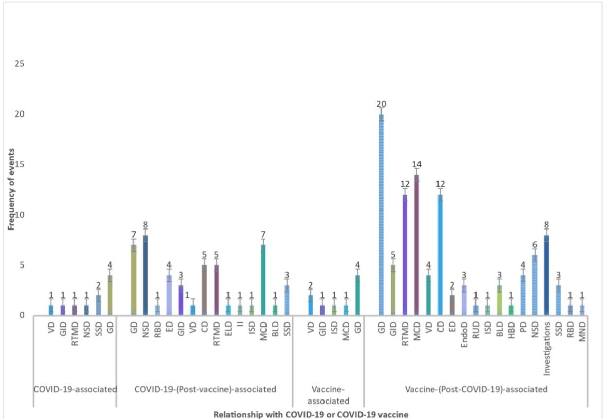 Des effets indésirables ont été observées chez 33/2544 (1,3 %) vaccinés, dont un cas de myocardite et un cas d’hypersensibilité sévère. Les personnes atteintes d’hypothyroïdie couraient un risque 5 fois plus élevé et celles qui recevaient un vaccin après avoir récupéré de la COVID-19 couraient un risque 3 fois plus élevé de problèmes de santé persistants