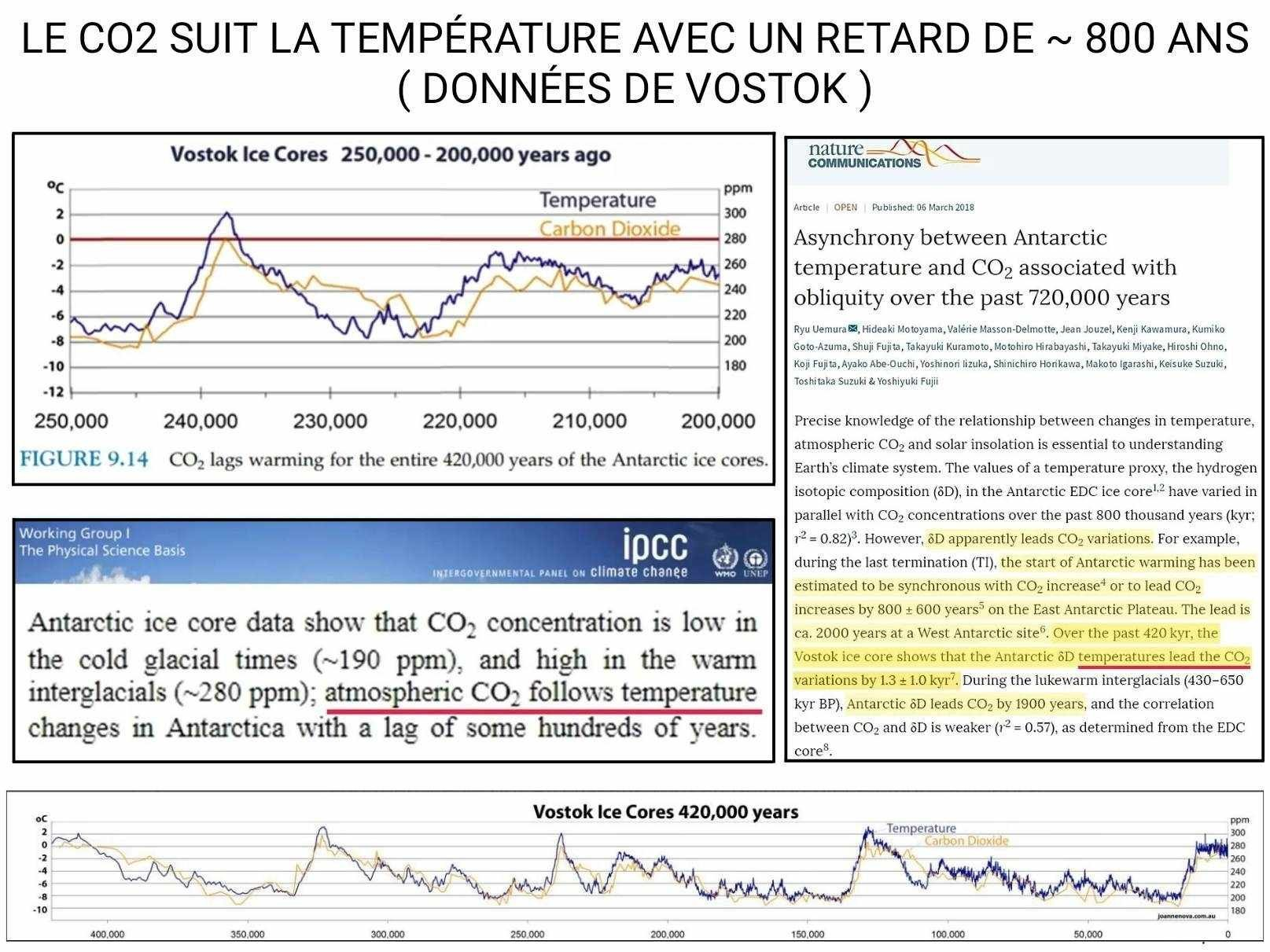 Les forages de Vostok ont montré que la température varie AVANT lea teneur en CO2; celui-ci ne peut donc être la cause de la température.