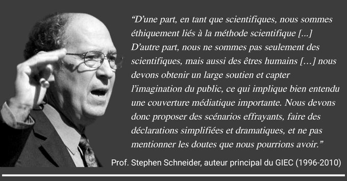 ONU-GIEC doivent “proposer des scénarios effrayants et dramatiques” pour “capter l’imagination du public” à l’aide d’une “couverture médiatique importante” et “ne pas mentionner de doute”. Cette posture est toujours en vigueur. https://judithcurry.com/2011/07/21/stephen-schneider-and-the-%E2%80%9Cdouble-ethical-bind%E2%80%9D-of-climate-change-communication/