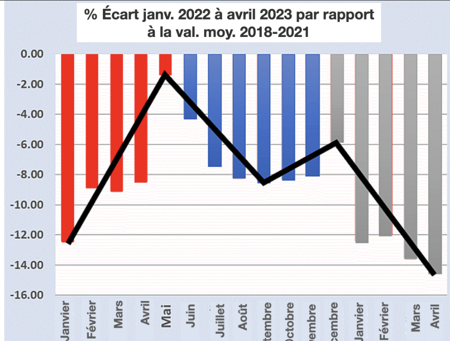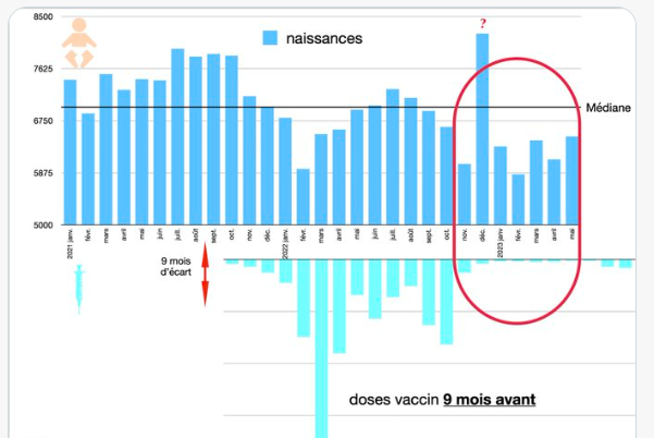 Et malgré la baisse des dosesinjectées 9 mois avant ( en 2022) , les naissances 2023 n’ont pas retrouvé leur niveau antérieur