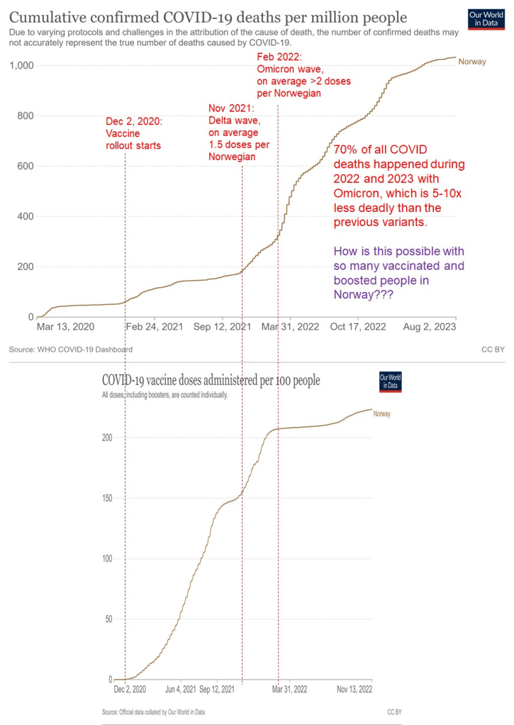 L’histoire du COVID en Norvège. Plus de 70 % de tous les décès par COVID en Norvège se sont produits en 2022 et 2023 avec Omicron, qui est intrinsèquement 5 à 10 fois moins meurtrier que les variantes précédentes. Comment est-ce possible avec autant de personnes vaccinées et boostées en Norvège ???