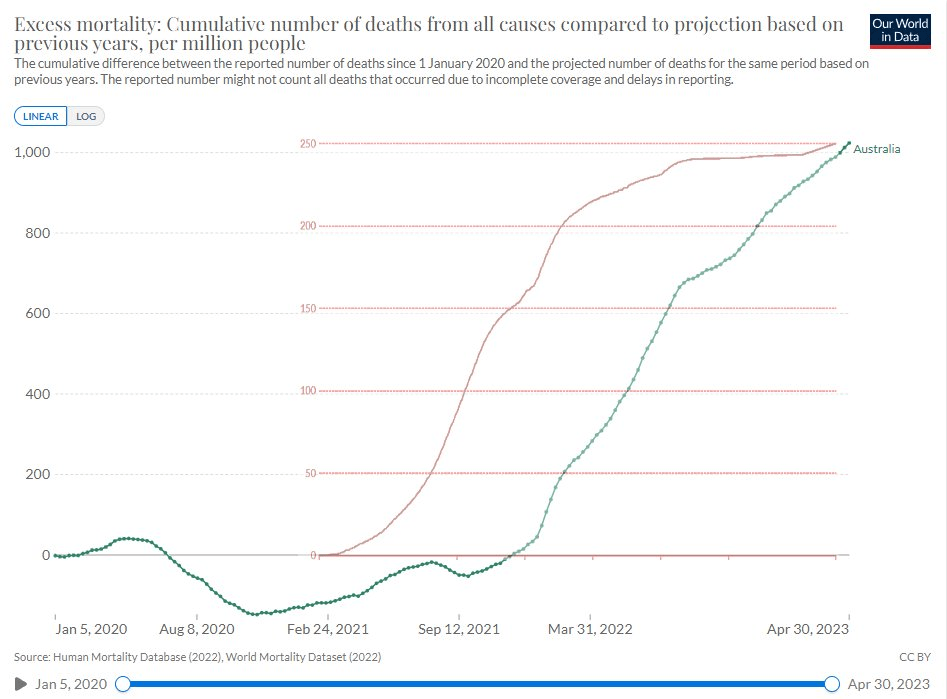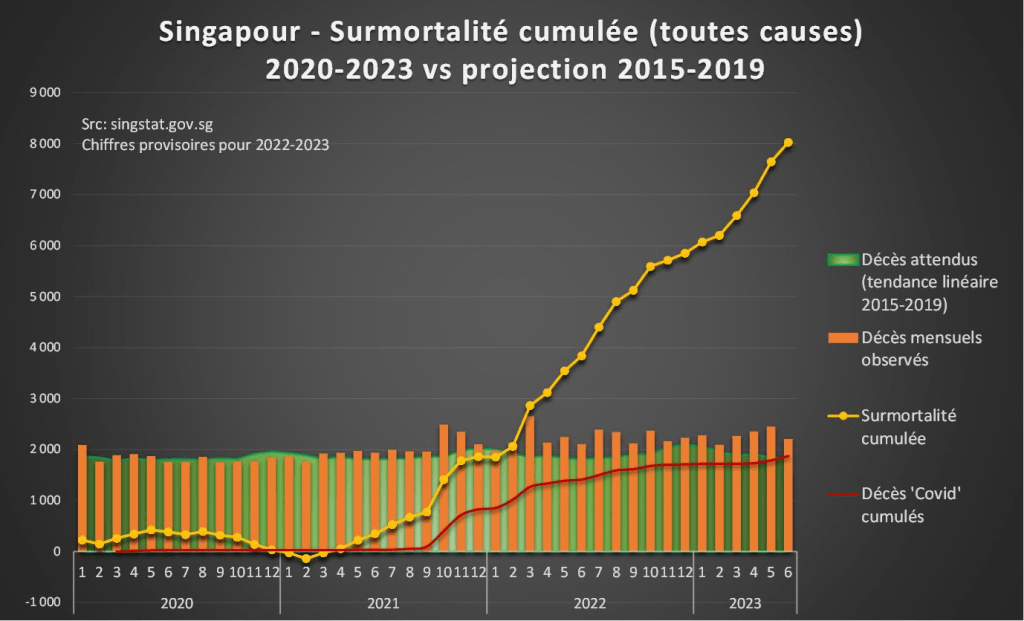 Le scénario est toujours le même dans ces pays, aucune surmortalité en 2020, peu de covid. Puis en 2021, les injections, toutes la population est « protégée et alors tout se dérègle, explosion des décès covid…. avec le gentil Omicron et explosion de la surmortalé toutes causes en 2022 et 2023…