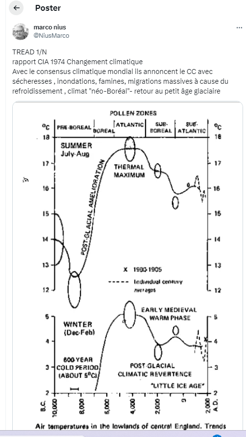 20. Central Intelligence Agency des États-Unis, 1974 (2) « Une étude de la recherche climatologique en ce qui concerne les problèmes de renseignement » Les plus grands climatologues du monde occidental ont confirmé les rapports récents faisant état d’un changement climatique mondial préjudiciable . La stabilité de la plupart des pays repose sur une source fiable de nourriture, mais cette stabilité ne sera pas possible dans la nouvelle ère climatique. Une prévision de l’Université du Wisconsin prévoit que le climat de la Terre reviendra à celui de l’ère néo-boréale (1600-1850) – une ère de sécheresse, de famine et de troubles politiques dans le monde occidental [le Petit Âge Glaciaire] . … Le monde revient au type de climat qui a existé au cours des 400 dernières années. Autrement dit, le climat anormal de l’optimum agricole est remplacé par un climat normal de l’ère néo-boréale.