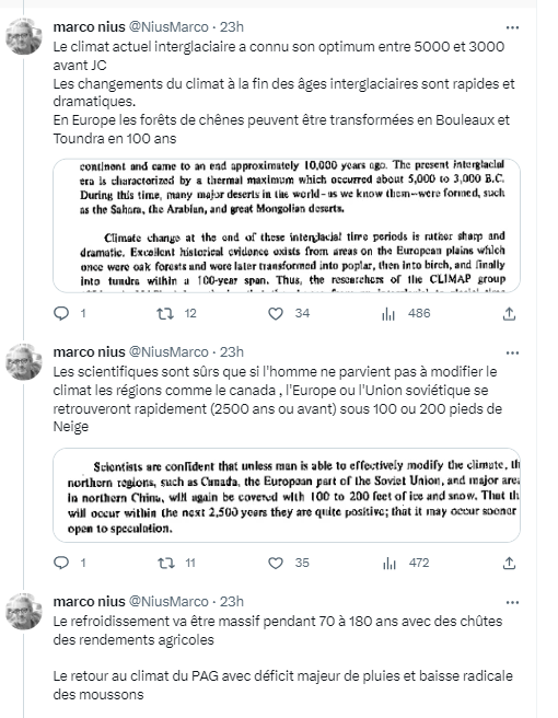 42. Gates, 1976 Les données enregistrées montrent qu’entre 1940 et le début des années 1970, la température moyenne dans l’hémisphère Nord a lentement diminué, avec un refroidissement net d’environ 1 °F [-0,55 °C] sur les continents et un refroidissement moindre sur les océans. Nous savons également qu’entre 1890 et 1940 environ, l’air sur au moins les continents de l’hémisphère Nord a subi un réchauffement progressif de plus de 1,5°F [+0,83°C] . … La question de savoir si ces fluctuations sont principalement le résultat des activités humaines ou s’il s’agit uniquement de variations climatiques naturelles reste ouverte . … D’après les documents historiques, nous savons également que des fluctuations climatiques similaires se sont déjà produites sur au moins certaines parties de la Terre.L’époque autour de l’an 1000 après JC, par exemple, était une période de chaleur inhabituelle dans la région de l’Atlantique Nord et en Europe et se caractérisait par des hivers relativement doux sur une période de plusieurs centaines d’années. C’est ce qu’on appelle l’optimum climatique et cela coïncide avec la période d’exploration et de colonisation viking du Groenland et de l’Amérique du Nord.