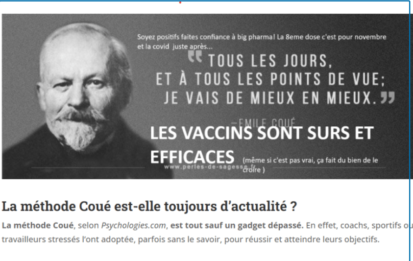 D’un point de vue scientifique ça ne marchera pas. Rassurez vous, il reste la fameuse méthode Coué,La méthode Coué, présentée dans les années 1920 et éditée (et rééditée) depuis à grande échelle, est une forme d’autosuggestion (ou d’autohypnose) fondée sur la répétition d’une formule clé : les vaccins sont sûrs et eFFICACES