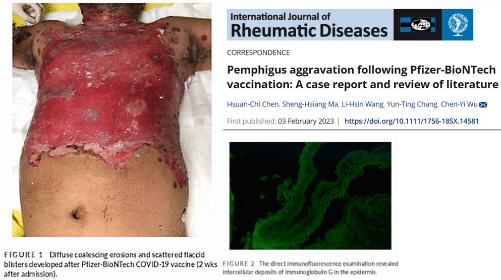 https://onlinelibrary.wiley.com/doi/epdf/10.1111/1756-185X.14581… « … dans la semaine suivant la réception de la 1ère dose du vaccin Pfizer-BioNTech COVID-19, des vésicules et érosions douloureuses ont progressé rapidement sur ce tronc et ces membres.