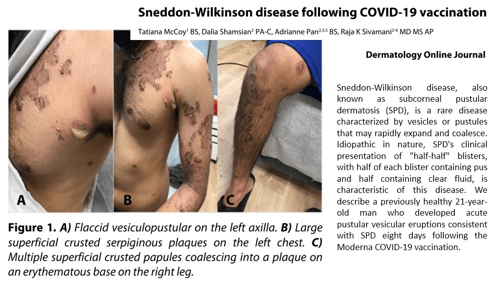 Maladie de Sneddon-Wilkinson après vaccination contre le COVID-19 : https://escholarship.org/uc/item/2bj24421… « Cette survenue de dermatose pustuleuse sous-cornéenne ne doit pas non plus décourager l’administration des vaccins contre le COVID-19… »