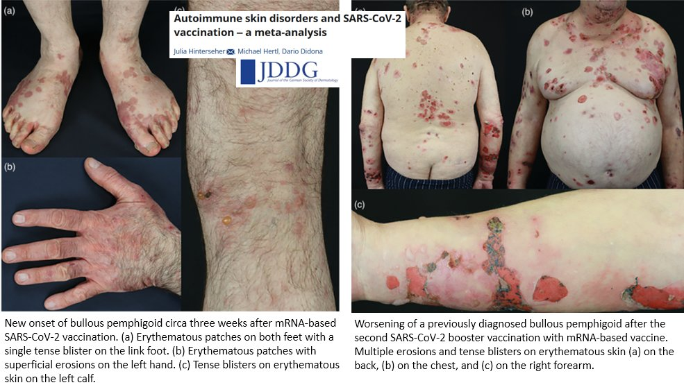 « Notre méta-analyse met en évidence un lien entre la vaccination #COVID et l’apparition ou l’aggravation de maladies cutanées inflammatoires et auto-immunes » https://onlinelibrary.wiley.com/doi/10.1111/ddg.15114… « Le nombre réel d’apparition ou d’aggravation de maladies cutanées auto-immunes après la vaccination contre le SRAS-CoV-2 pourrait être sous-