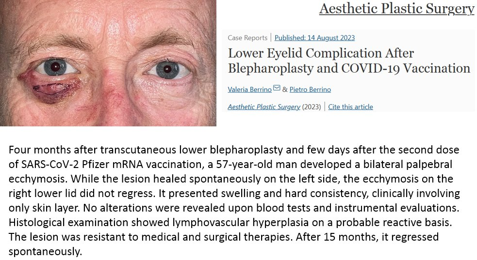 Complication de la paupière inférieure après blépharoplastie et vaccination contre le COVID-19 : https://pubmed.ncbi.nlm.nih.gov/37580564/ « Nous pouvons émettre l’hypothèse que la réponse post-vaccinale pourrait provoquer une microangiopathie localisée par la formation d’un thrombus et une ischémie conséquente dans la zone de guérison … »