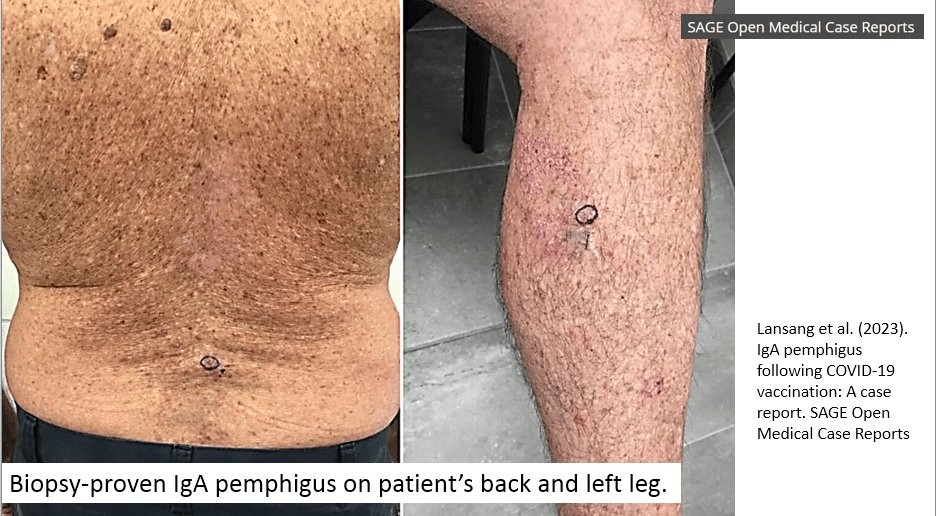 Pemphigus IgA après vaccination COVID-19 – > https://journals.sagepub.com/doi/10.1177/2050313X231181022… « Les médecins doivent être conscients du nombre croissant d’effets indésirables qui peuvent survenir après la vaccination contre le COVID-19 chez les patients sensibles. »