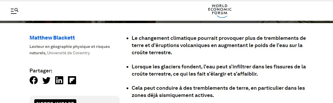 On savait qu’ils y viendraient DAVOS affirme que le changement climatique provoque des tremblements de terre et des éruptions volcaniques. Les gens vont Gober ça tranquille https://weforum.org/agenda/2023/08/climate-change-trigger-earthquakes-volcanoes/