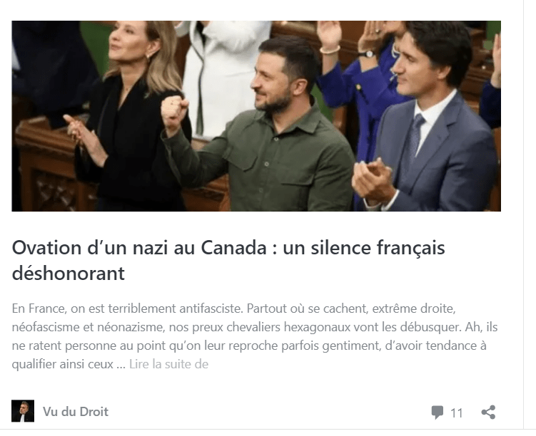 Il y a au moins un endroit où ce spectacle a dû être apprécié, c’est probablement le ministère des Affaires étrangères russes. Possible qu’on y ait bu du champagne de Crimée pour fêter la façon dont Justin Trudeau venait de pulvériser un mythe occidental patiemment construit : « il n’y a pas de nazis en Ukraine ». Jusqu’en février 2022, des gouvernements, des institutions, des O.N.G. et la presse avaient souligné en Occident l’existence d’un courant néonazi multi-facettes en Ukraine. Il était assez facile de retrouver articles, photos, vidéos jusqu’à des rapports du Parlement français ou du Congrès américain qui pointaient cette situation. Vladimir Poutine ayant avancé l’objectif de « dénazification » de son opération militaire en Ukraine, le dispositif de propagande occidentale a pris un virage à 180° et les néonazis ont disparu. Ou quand il n’était pas possible de nier le réel, tout était fait pour l’atténuer et présenter ce qui est un courant ancien dans l’Ouest ukrainien sous les traits d’un folklore inoffensif. Eh bien si, il y a des nazis en Ukraine, et d’ailleurs pas seulement en Ukraine, la preuve. On imagine aussi l’effet sur l’opinion publique russe du dévoilement qu’a provoqué cette séquence infecte. La Russie dont on sait la mémoire brûlante de la guerre d’extermination qu’elle a subie entre 1941 et 1945, OK c’est bon article a pu constater que l’Occident portait en triomphe ceux que les nazis avaient chargé des pires exactions contre leur peuple.