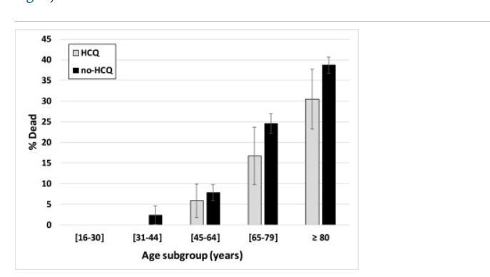 Les patients qui n’ont pas reçu d’HCQ présentaient un risque de mortalité 57 % plus élevé. Le bénéfice en termes de survie dans le groupe de traitement était constant dans tous les groupes d’âge.