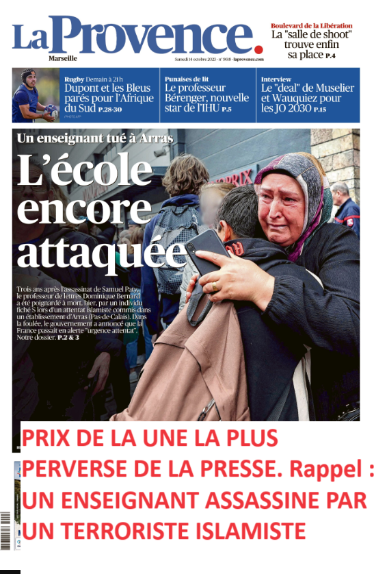 La Provence, dont la Une semble indiquer un attentat anti musulman à ARRAS…Que des mamans musulmanes est eu peur pour leurs enfants après la mort d’un professeur, personne ne peut le nier mais le choix de cette photo est pervers.