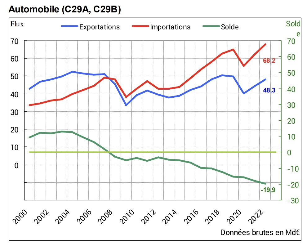 Avec -19,9 milliards d’euros en 2022, le déficit de la balance commerciale automobile française augmente à grande vitesse. La construction de voitures représente -15,6 milliards de ce déficit, les -4,3 milliards restant concernant la fabrication d’équipements automobiles. Il semble même s’accélérer, sachant qu’il se chiffre à 6 milliards d’euros rien que sur le dernier trimestre 2022. Cette balance commerciale automobile ne cesse de se dégrader depuis le début du siècle, à mesure que les constructeurs français ont délocalisé leur production à l’étranger. Les courbes entre exportations et importations de voitures se sont croisées pour la première fois en 2007, pour ne plus jamais se recroiser ensuite. L’écart entre les importations et les exportations s’est progressivement creusé, particulièrement à partir de l’année 2016. En 2022, les importations de voitures représentaient ainsi 68,2 milliards d’euros en données brutes, contre 48,3 milliards d’euros pour les exportations.