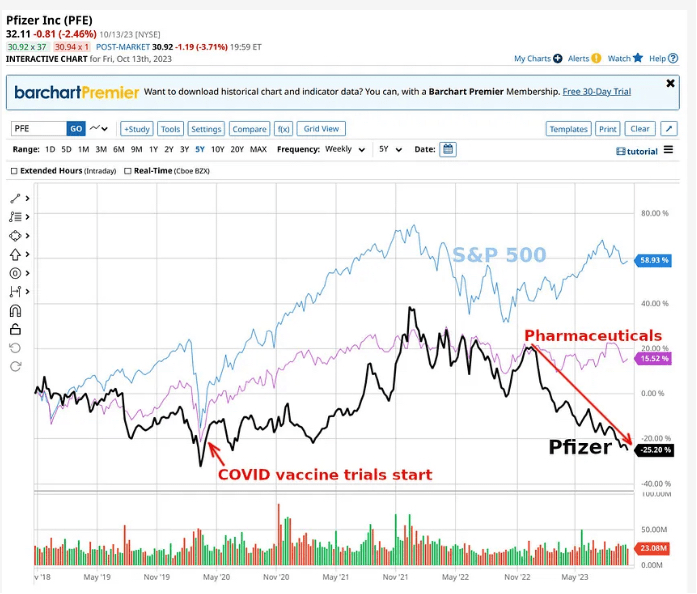 L’action Pfizer chute de 25% depuis son cours avant la pandémie en 2020. Effondrement de 50% depuis ses plus hauts atteints en 2021. Les 100 milliards de fonds publics payés frauduleusement pour leur faux vaccin ont détruit de la valeur.