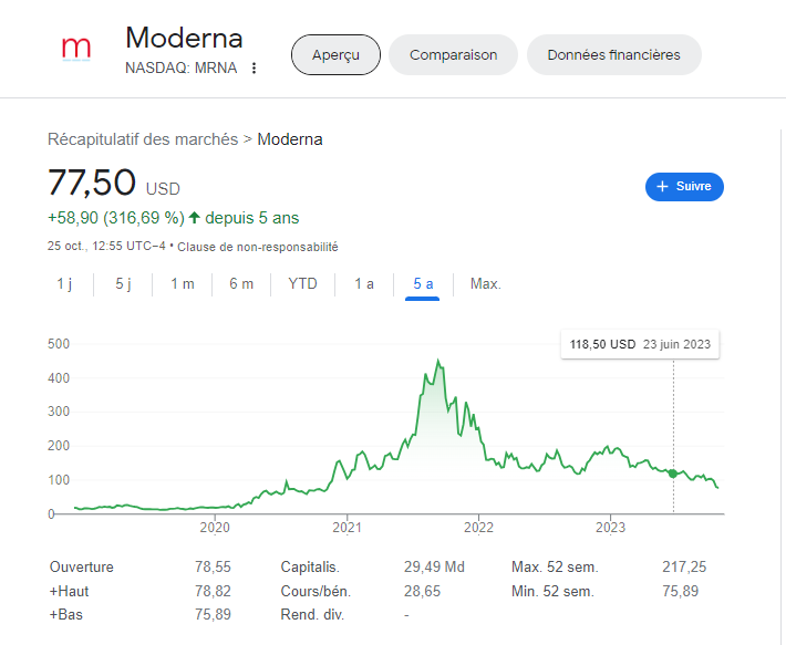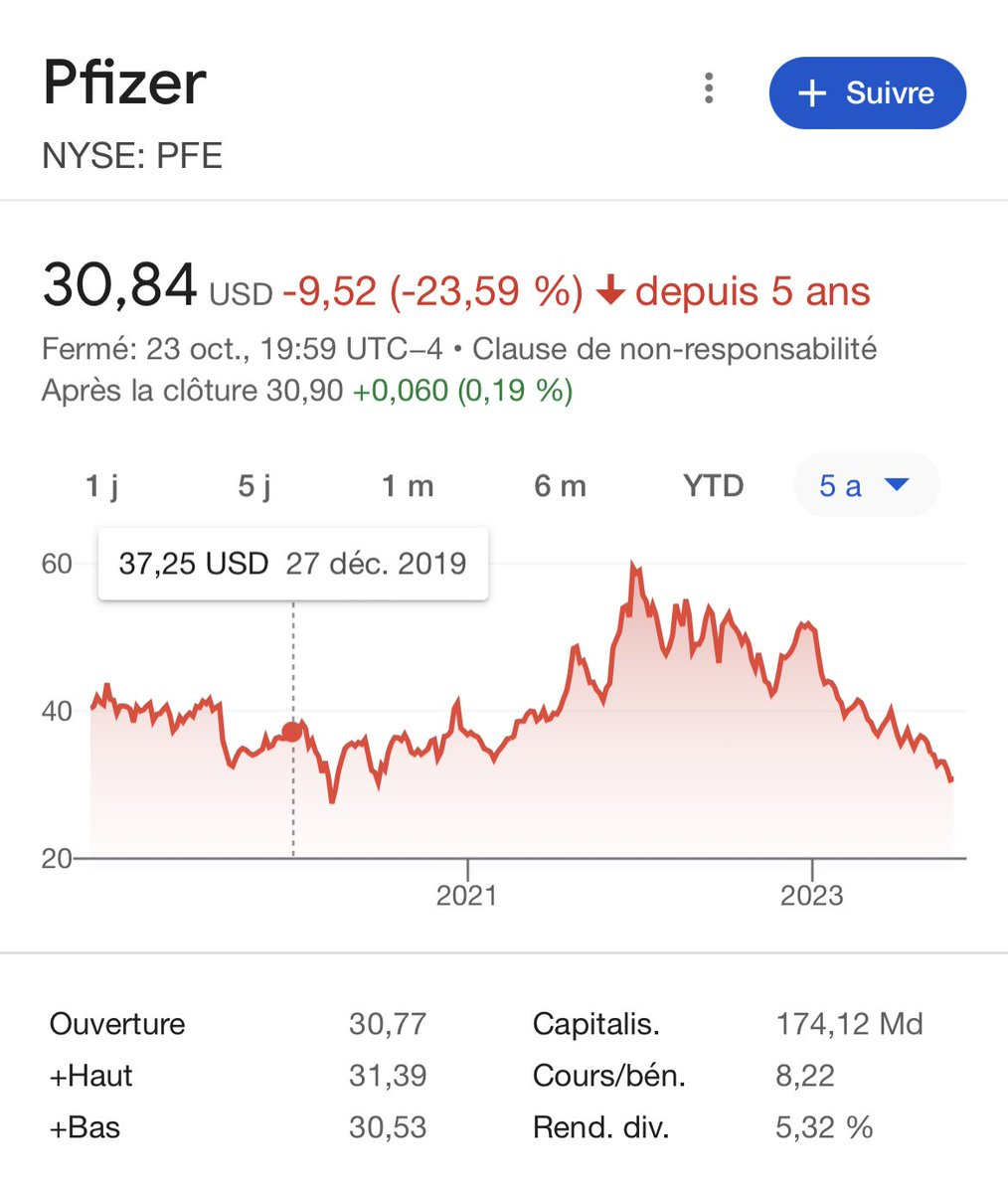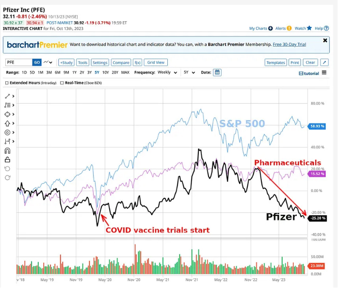 L’action Pfizer chute de 25% depuis son cours avant la pandémie en 2020. Effondrement de 50% depuis ses plus hauts atteints en 2021. Les 100 milliards de fonds publics payés frauduleusement pour leur faux vaccin ont détruit de la valeur.