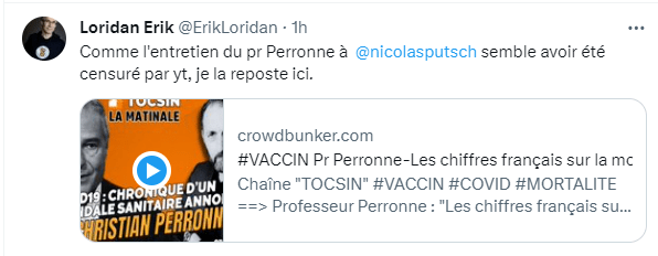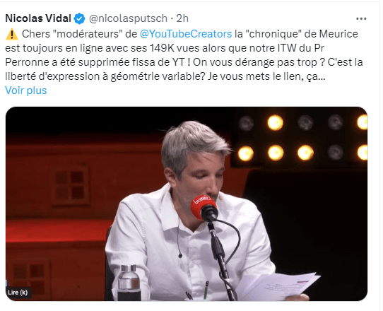 @Tocsin_Media et la suppression de mon interview du Pr.Perronne qui venait d’atteindre les 100000 vues ainsi que la suppression de l’intégralité de la matinale ! A revoir en intégralité ici : https://youtube.com/watch?v=u_o_ETIjnCE&t=8s
