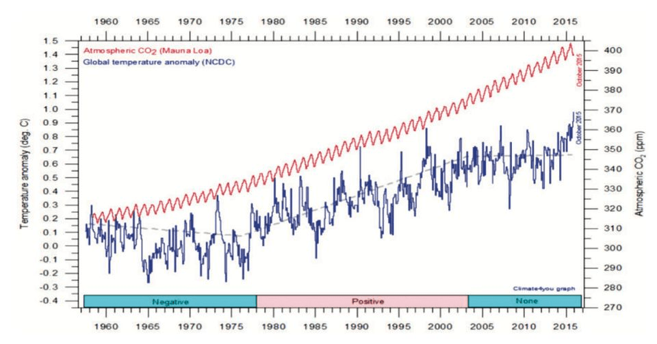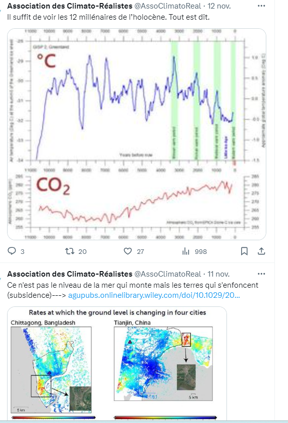 Ce double graphique démontre que le CO2 ne guide pas les températures. La corrélation est mauvaise. Il y a des périodes de stagnation et même de baisse alors que la hausse du CO2 est continue. Via Mika Cla on Fb, Collectif des Climato Réaliste