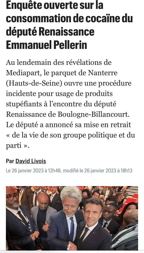 Mediapart a révélé qu’Emmanuel Pellerin député du groupe Renaissance a consommé de la cocaïne avant et après son élection à l’Assemblée. Confronté aux enquêteurs , il a reconnu cet usage illégal. Dans un communiqué, le député a annoncé son «retrait» du groupe Renaissance à l’Assemblée, ainsi que du parti présidentiel qui envisageait de l’exclure