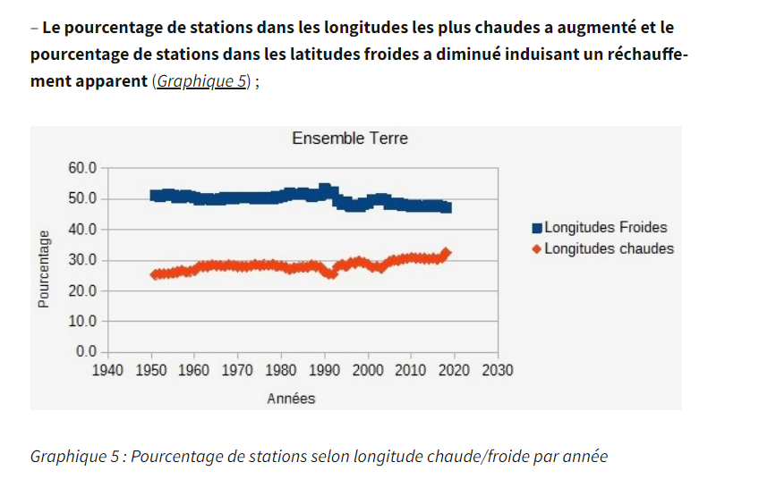 Le déplacement des stations météorologiques pourrait expliquer au moins en partie l’augmentation de plus de 1ºC de la température globale calculée depuis plus de 40 ans. Le présent travail concerne uniquement les stations terrestres et les quelques stations maritimes (14 sur 7371 dans la base de données du GISS) qui servent de référence pour calculer la température globale moyenne sur environ 30% de la surface de la Terre. Il concerne les années 1951 à 2018, soit les années de référence 1951-1980 du GIEC plus les années ultérieures pour la mise en évidence du réchauffement climatique apparent.
