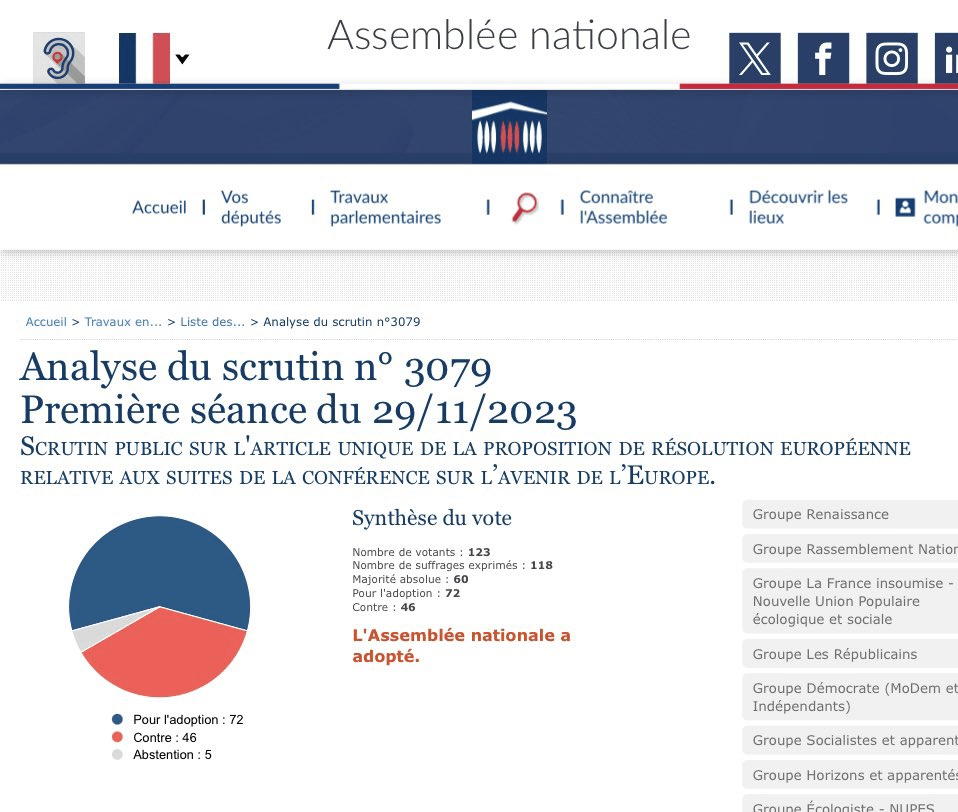 La simplification du processus d’élargissement de l’UE. Renaissance, le Modem, Horizons et le PS ont voté pour. Même si la portée d’une résolution est limitée, cela en dit long sur la volonté de passage en force de certains vers le fédéralisme