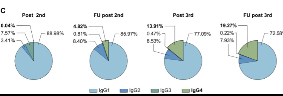 Le mécanisme le plus spectaculaire est sans doute le changement de la composition des anticorps qui accompagne la multiplication des rappels . De plus en plus d’IgG4 et c’est dramatique : cancers, maladies auto immunes…risque global plus élevé de cancer, notamment du pancréas et de lymphome