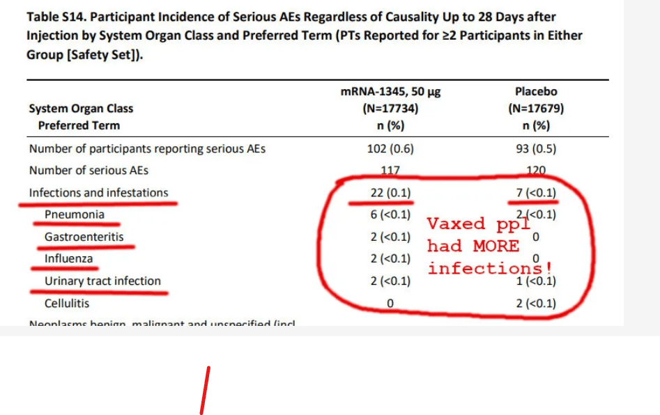 le vaccin a évité 66 cas de VRS parmi 17 793 personnes vaccinées mais dans le groupe 5337 vaccinés ont souffert d’effets secondaires du vaccin= 81 événements indésirables par rhume évité