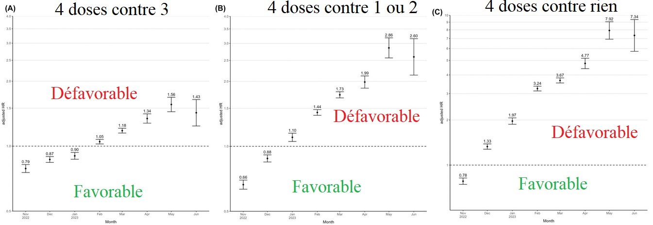 Chez les participants ayant reçu quatre, trois, une à deux et aucune vaccination, nous avons enregistré respectivement 1 568, 1 748, 607 et 566 décès toutes causes confondues entre le 1er novembre et le 31 décembre 2022.
