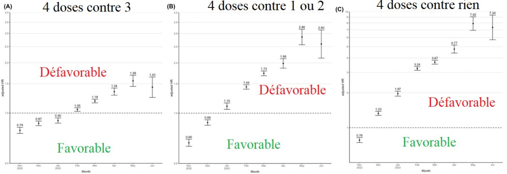 Les auteurs de cette étude observationnelle  sont particulièrement gênés. Ils voulaient prouver l’utilité de la quatrième dose  et ils démontrent le contraire, pire, avec Omicron  plus on est dosé, plus on risque d’être contaminé et de mourir de la covid
