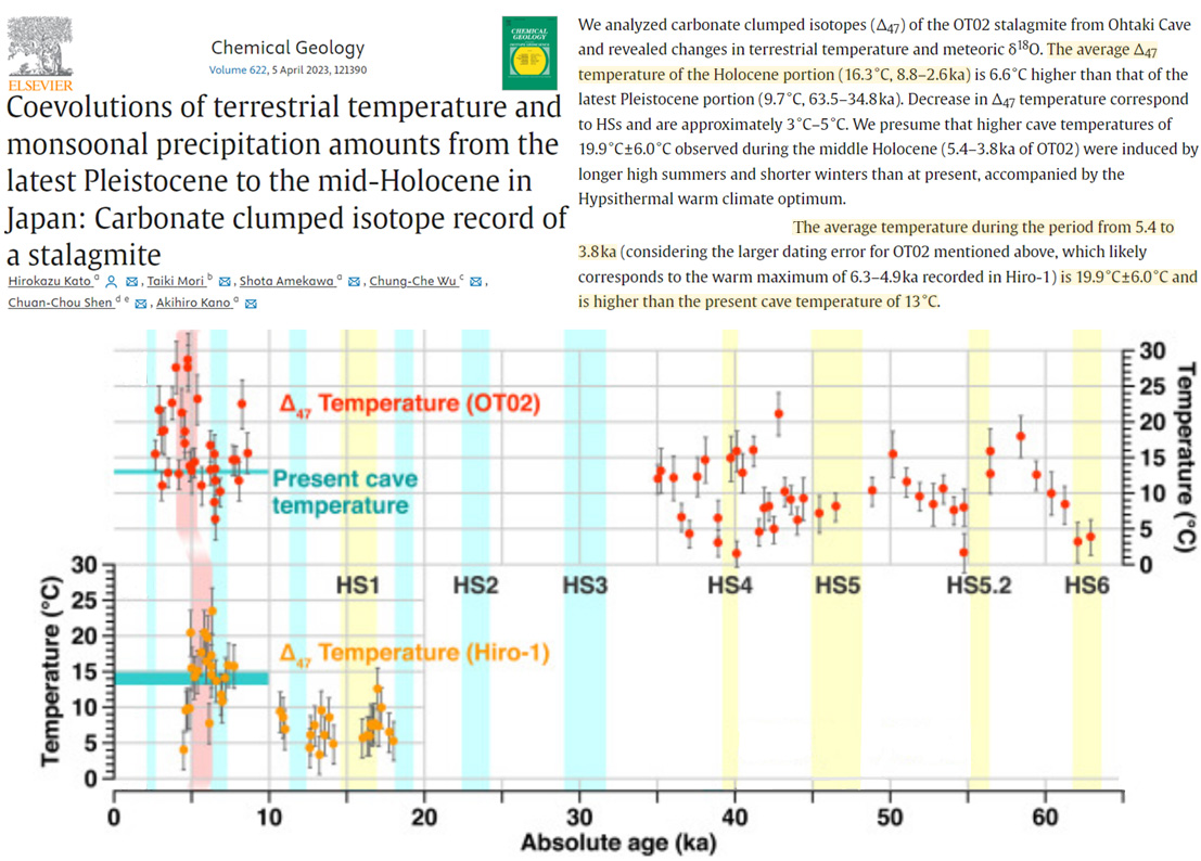 Une autre nouvelle étude indique que la moyenne climatique était beaucoup plus chaude (19,9°C) au milieu de l’Holocène qu’aujourd’hui (13°C) au Japon. Le climat ici était également plus chaud qu’il y a environ 35 à 40 000 ans et environ 55 à 60 000 ans aujourd’hui, lorsque l’on disait que le CO2 était inférieur à 200 ppm. https://sciencedirect.com/science/article/pii/S0009254123000906