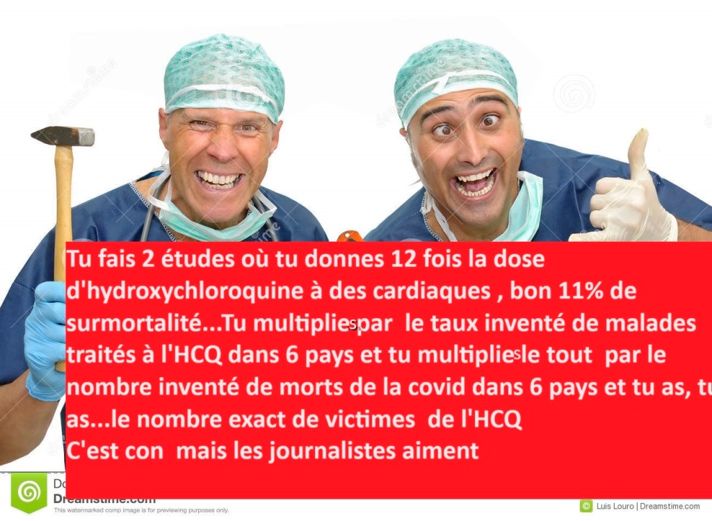 Ils ont osé! Utiliser la surmortalité provoquée par un surdosage toxique (4 à 12 fois les recommandations d’hcq) puis multiplier ce taux par un pourcentage bidonné de patients traités à l’hcq, letout multiplié par le nombre bidonné de morts de la covid afin d’obtenir le chiffre exact de victimes de l’HCQ.