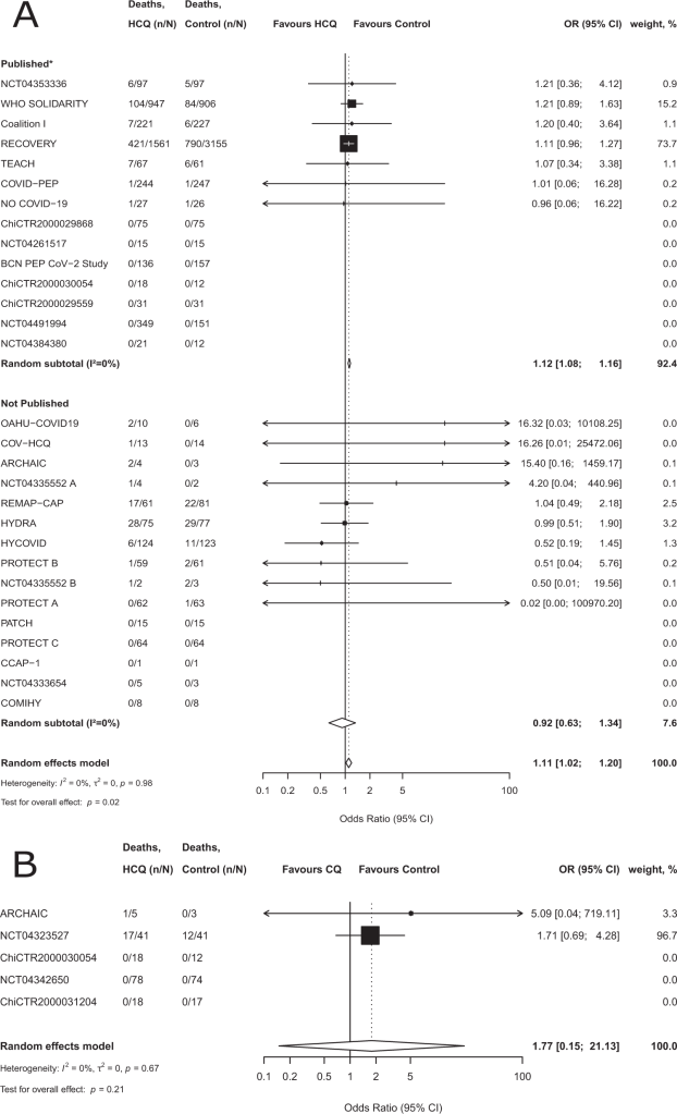 Nous avons utilisé l’odds ratio (OR) pour la mortalité liée à l’HCQ estimée à partir d’une méta-analyse précédente d’ ECR (c’est-à-dire OR=1,11) [12] .