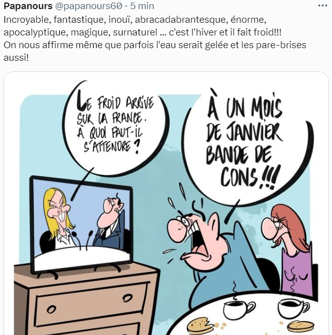 Mais m’sieur, s’il fait très froid, c’est que cela prouve bien que lorribl réchauffement aux tropiques est bien vrai. Il est logique que la presse subventionnée et donc aux ordres ne parle pas de ces bouseux, les pouilleux que nous somment pourraient tiquer