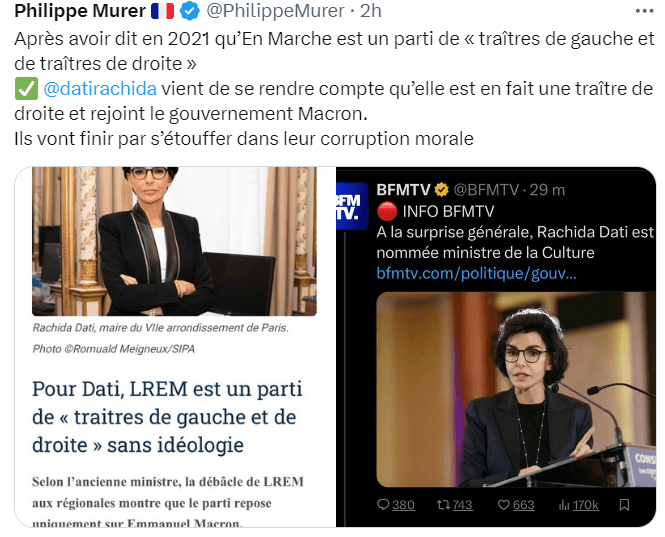 Rachida Dati à la culture… Je l’aimais bien contre Hidalgo, mais là une belle trahison… Cette Sarkozyste est en mission . Pour elle: se boboiser , récuperer les macroniens et se faire élire maire de Paris . Clément beaune et Bournazel seront out…