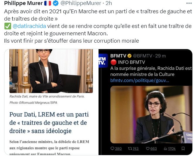 Rachida Dati à la culture… Je l’aimais bien contre Hidalgo, mais là une belle trahison… Cette Sarkozyste est en mission . Pour elle: se boboiser , récuperer les macroniens et se faire élire maire de Paris . Clément beaune et Bournazel seront out…