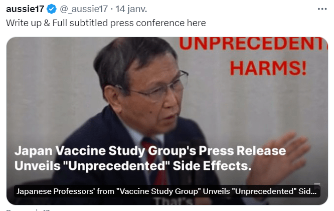 Conférence de presse « EFFETS SECONDAIRES SANS PRÉCÉDENT » du « Groupe d’étude sur les questions de vaccins » du Japon, 11 janvier 2024.