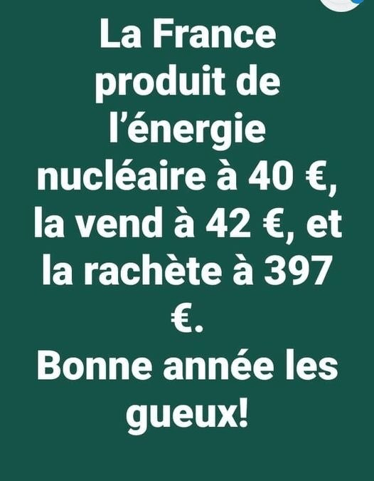 À défaut de mettre à genoux l’économie russe, Bruno Le Maire met à genoux les Français. C’est une honte alors qu’il suffirait de rétablir un prix national de l’électricité plutôt que d’appliquer l’absurde mode de calcul du marché de l’électricité de l’UE ! Les Espagnols l’ont fait….